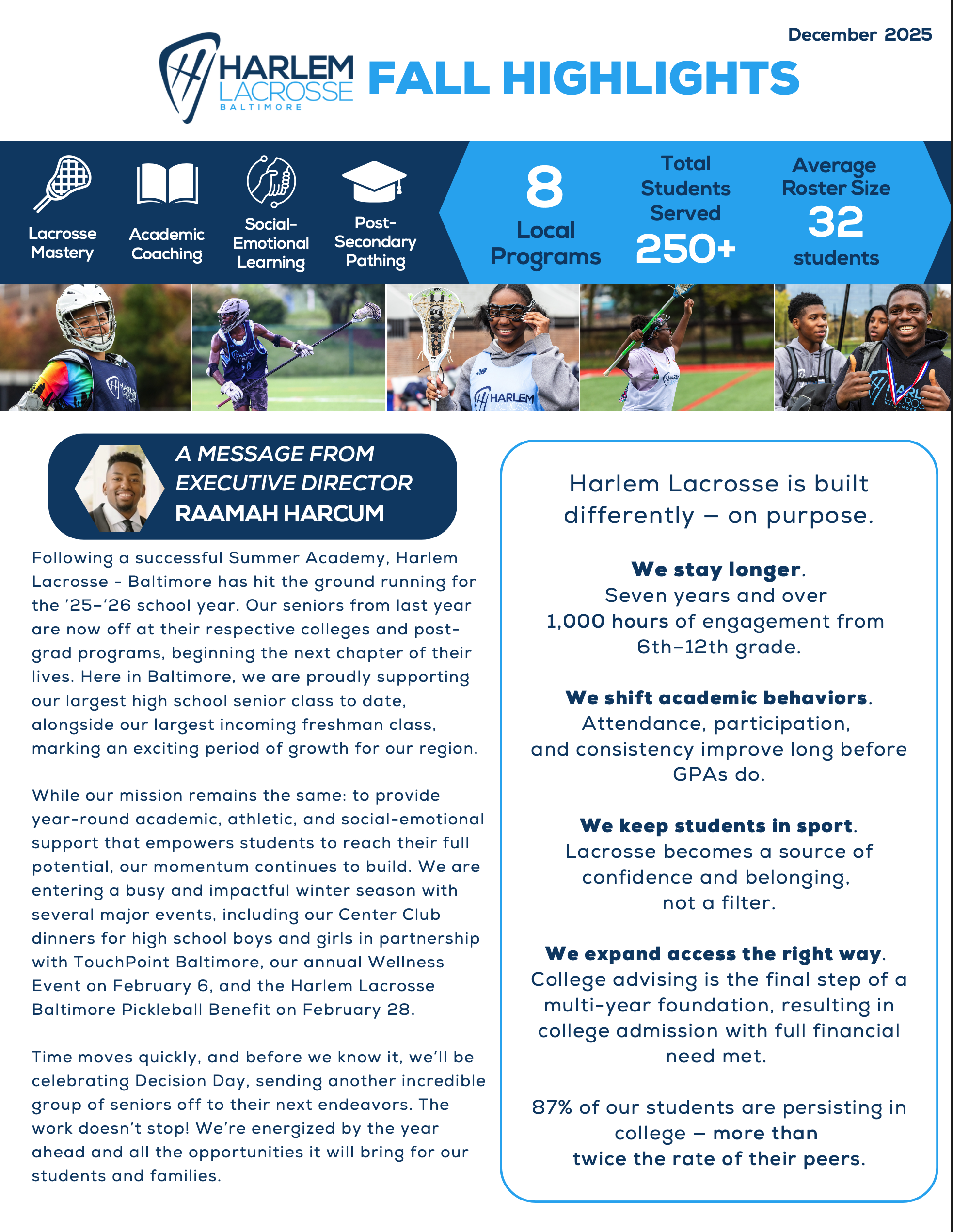 Harlem Lacrosse launched programming in Baltimore in the fall of 2014 at the Commodore John Rodgers School, our first school site outside of New York City. Harlem Lacrosse now serves over 150 boys and girls at 6 six programs.